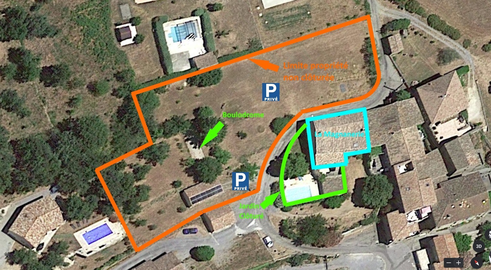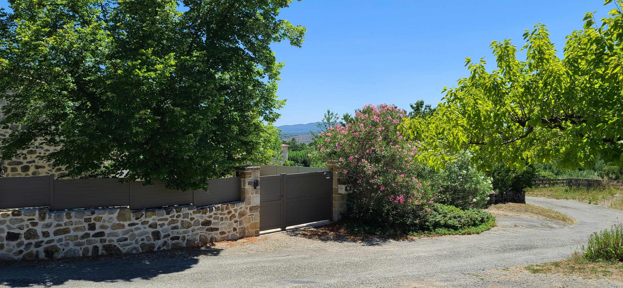 The house is in a cul-de-sac surrounded by a garden of over 3000 m2 (of which approx. 150 m2 is fenced). It lies at an altitude of 290 m, some 50 km from the Rhône valley (Montélimar). A large private parking lot makes it easy to park a dozen cars.